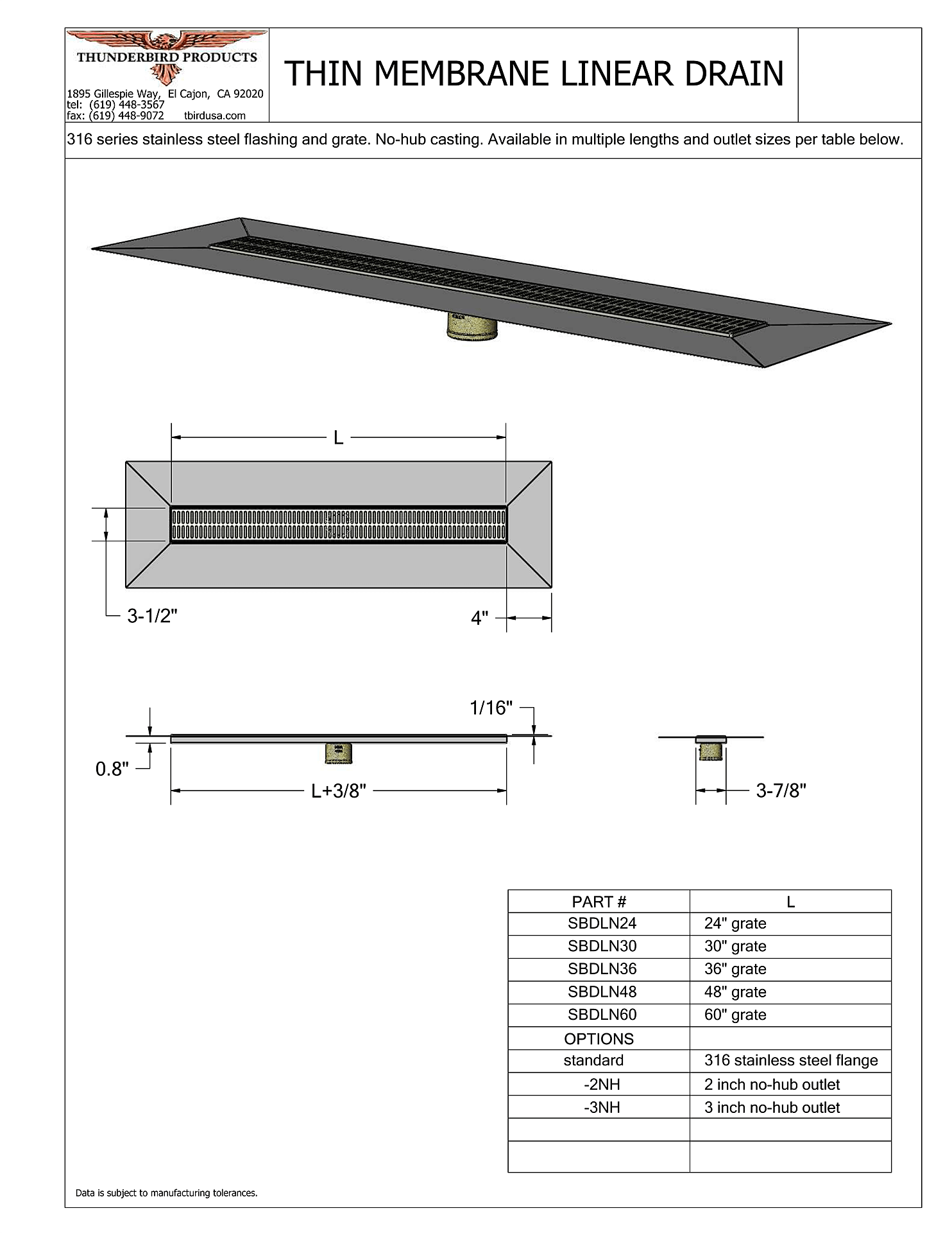 | SBDLN60 | 60" Marine Grade 316 Stainless Steel Linear Thin Membrane Drain |