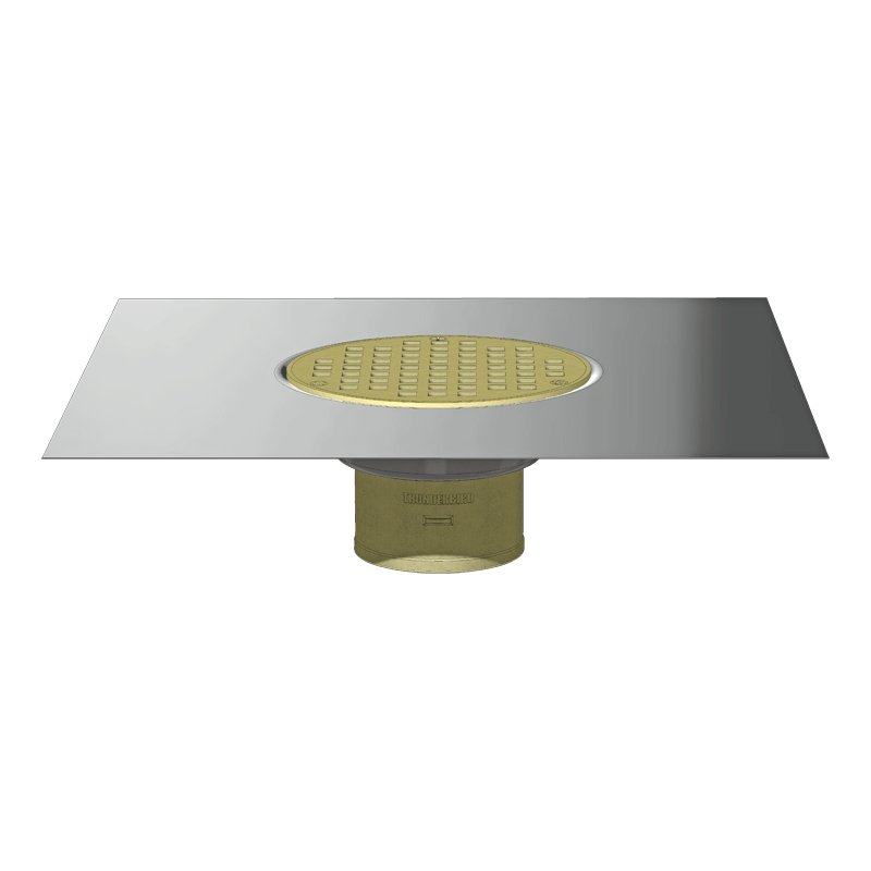 | BD63F90 | 3" No-Hub Stainless Steel Thin Membrane Commercial Floor Drain w/ 6" Round Bronze Grate w/ 90 Degree Copper Elbow * |